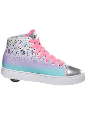 The Heelys Veloz Shoes - Aqua/Purple/Lt Pink is funky fresh with a 90's/80's inspired graphic that is nostalgic. They also have a silver toe and tongue that is sure to make other take notice in all the right ways. Heelys roller shoes are the original shoes with the wheel in the heel. These have wheels with ABEC5 bearings inside to ensure they roll nicely. They come with plugs and a removal tool if you'd like to remove the wheel and wear as regular shoes.